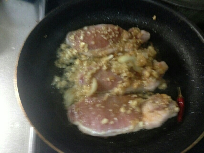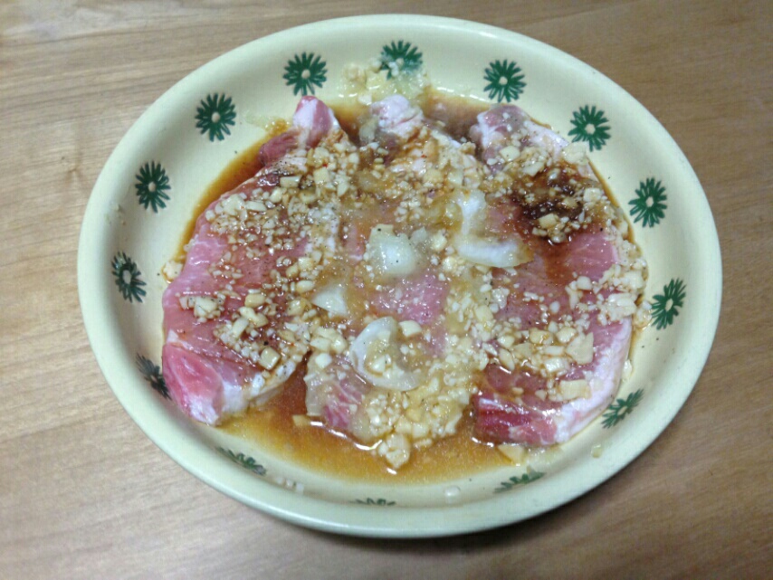 下味の塩コショウ、みりん、醤油(減塩)の中に、これでもかとぶっ叩いた豚ロースを漬ける。