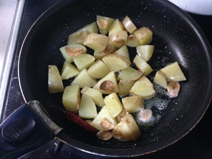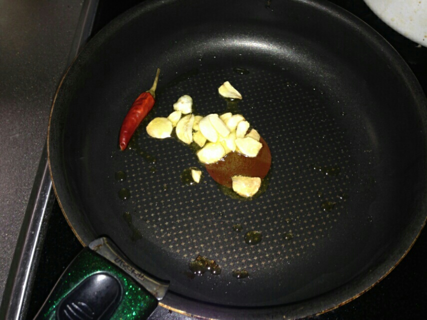 基本イタリアン・シェフな僕はつい癖でオリーブオイルを敷き、にんにくと鷹の爪を炒めちゃってる。(玉葱きざまないだけ重症ではない)